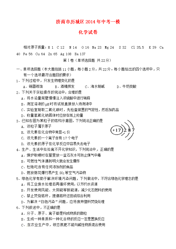 试题-山东-2014_山东省济南市历城区2014年中考化学一模试题