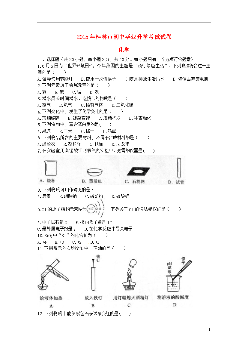 试题-广西-2015_广西桂林市2015年中考化学真题试题(无答案)