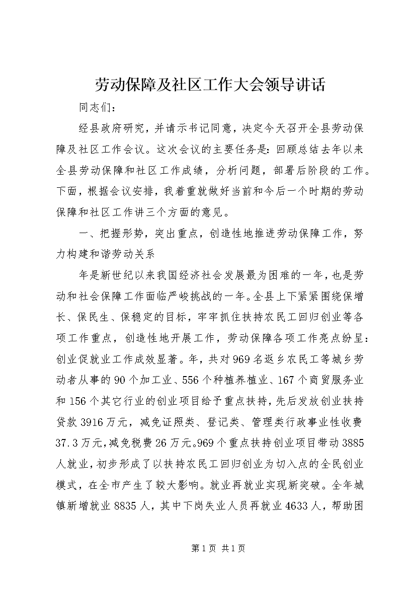 劳动保障及社区工作大会领导讲话