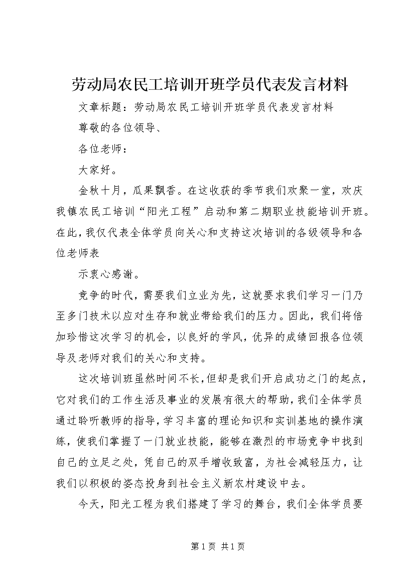 劳动局农民工培训开班学员代表发言材料 (2)