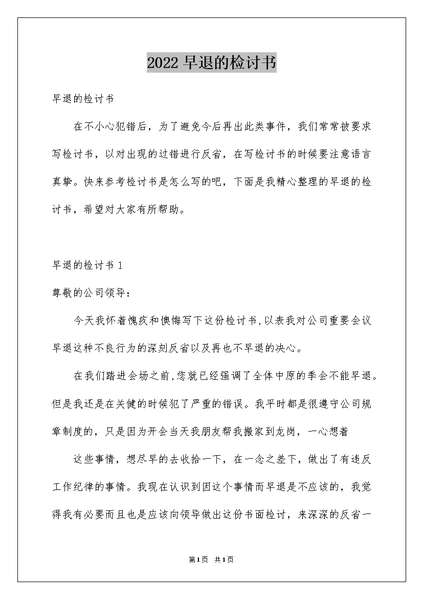 2022早退的检讨书