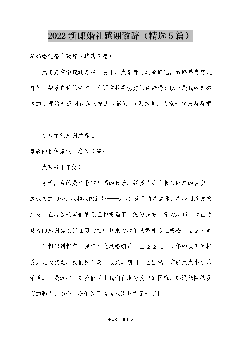 2022新郎婚礼感谢致辞(精选5篇)