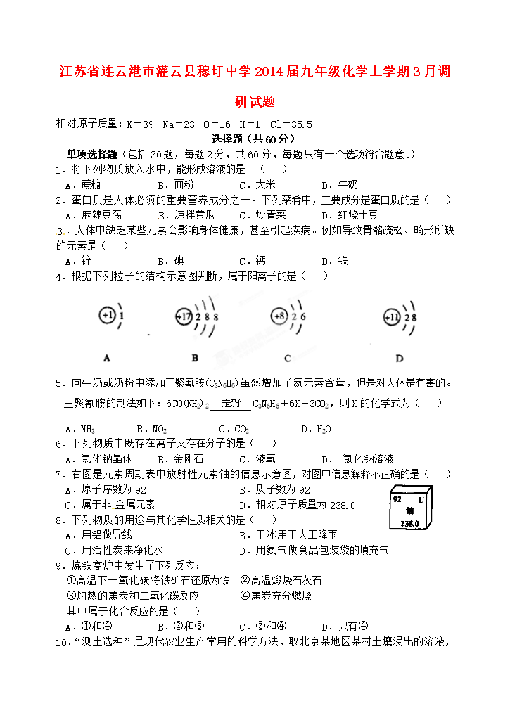 试题-江苏-2014_江苏省连云港市灌云县穆圩中学2014届九年级化学上学期3月调研试题