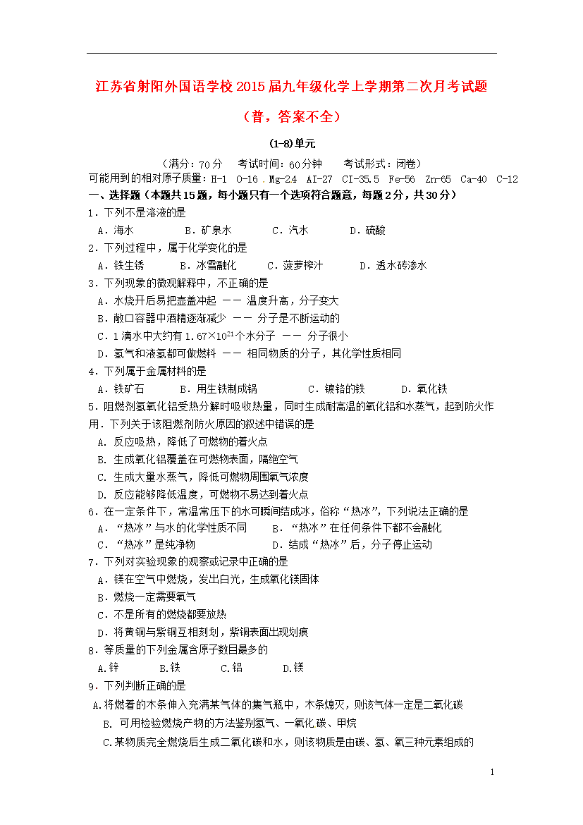 试题-江苏-2015_江苏省射阳外国语学校2015届九年级化学上学期第二次月考试题(普,答案不全)