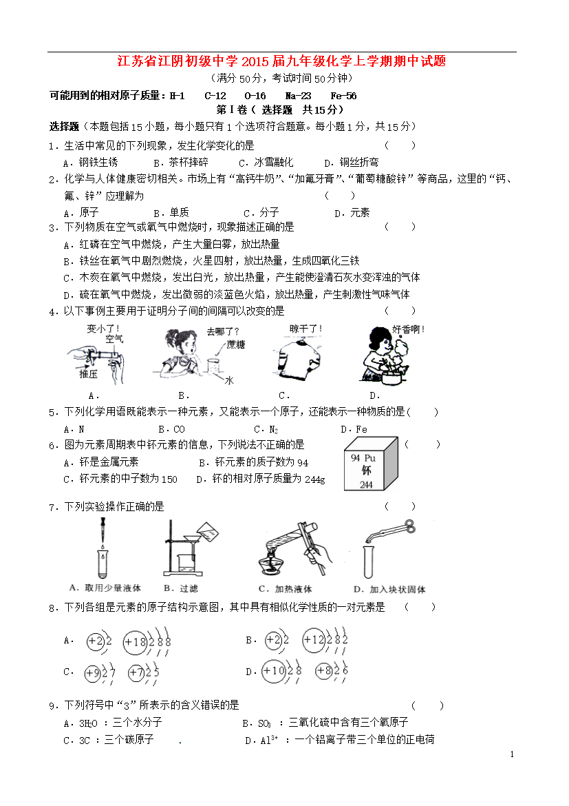 试题-江苏-2015_江苏省江阴初级中学2015届九年级化学上学期期中试题
