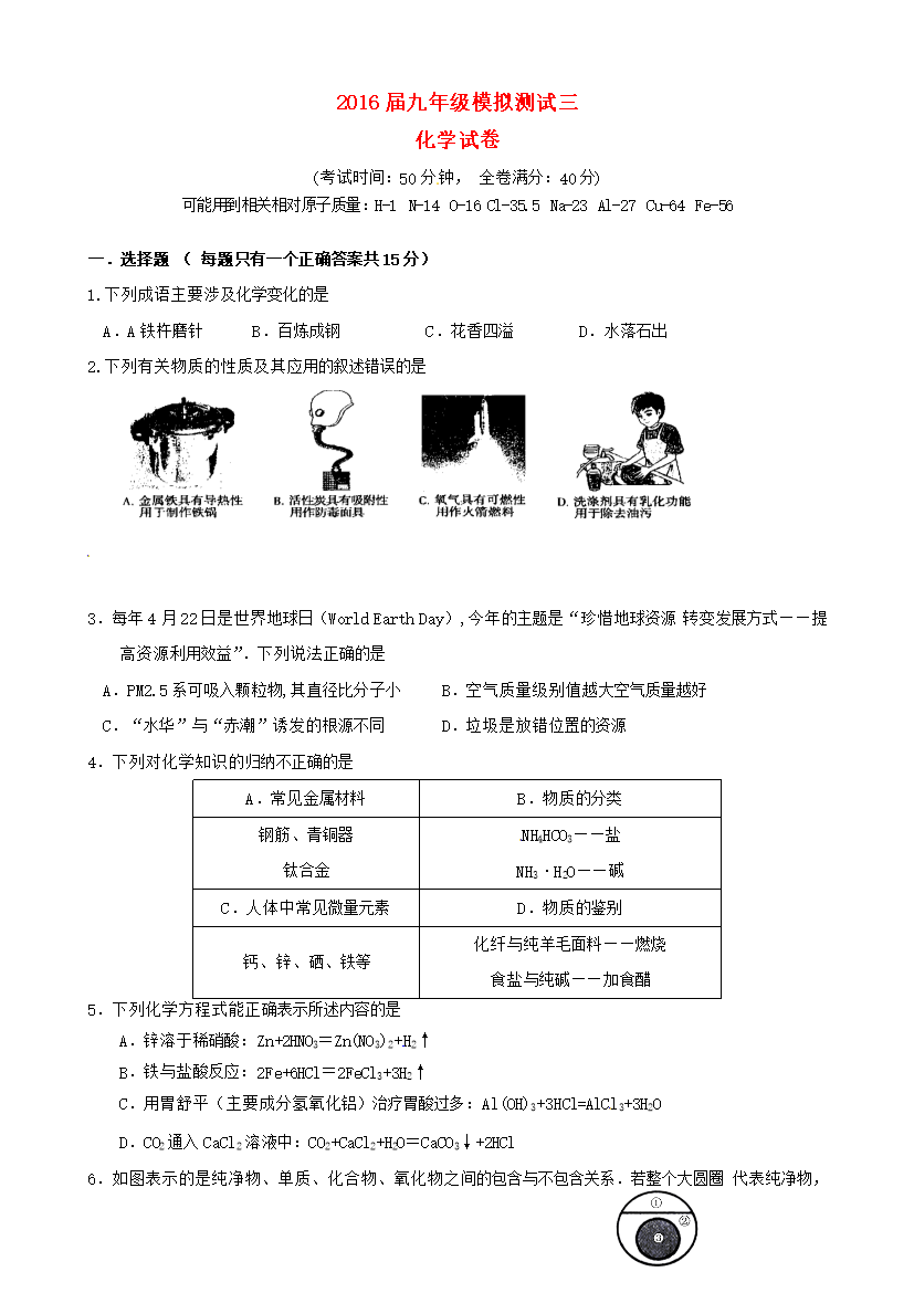 试题-江苏-2016_江苏省宿迁市2016届九年级化学三模试题(无答案)