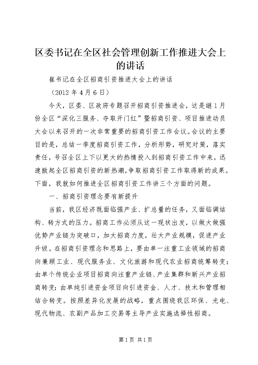 区委书记在全区社会管理创新工作推进大会上的讲话 (4)