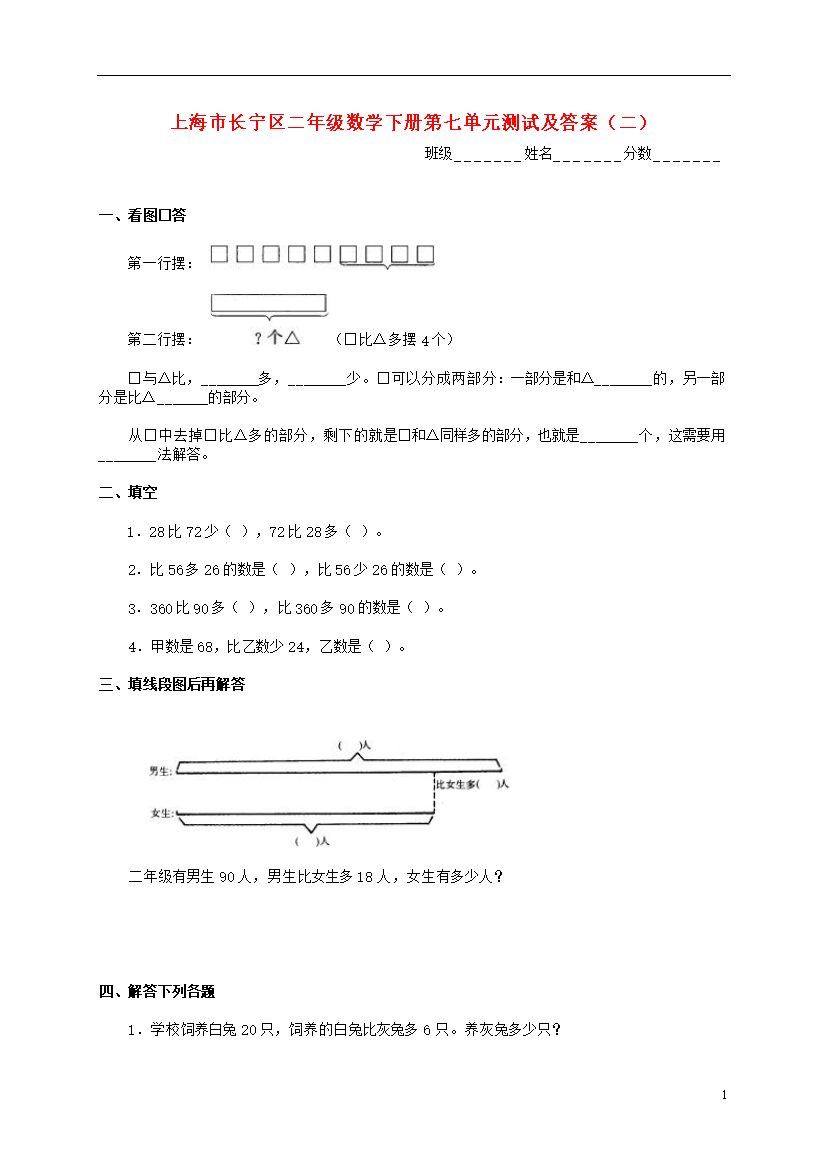 试题-上海-2011_上海市长宁区二年级数学下学期第七单元测试(二)