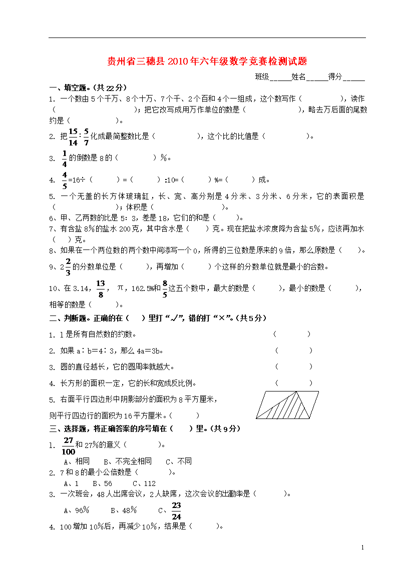 试题-贵州-2013_贵州省三穗县2010年六年级数学竞赛检测试题3(无答案)