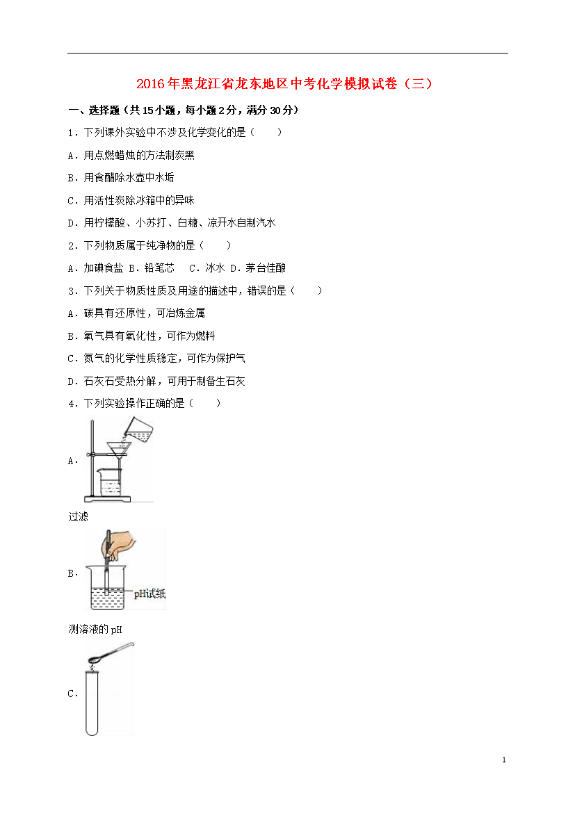 试题-黑龙江-2016_黑龙江省龙东地区2016届中考化学模拟试题(三)(含解析)