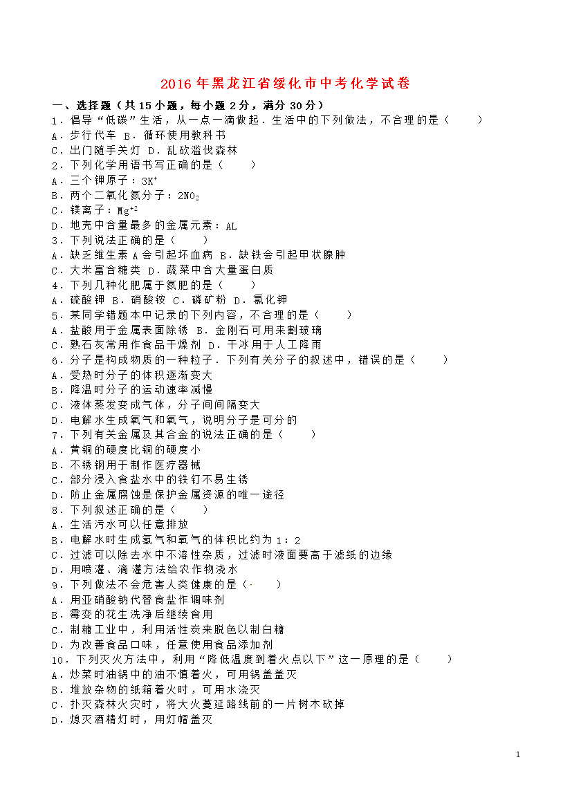 试题-黑龙江-2016_黑龙江省绥化市2016年中考化学真题试题(含解析)