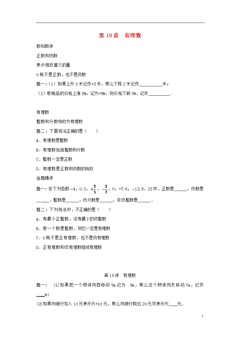 试题-全国-2018_小升初数学衔接专项训练 第19讲 有理数(无答案)