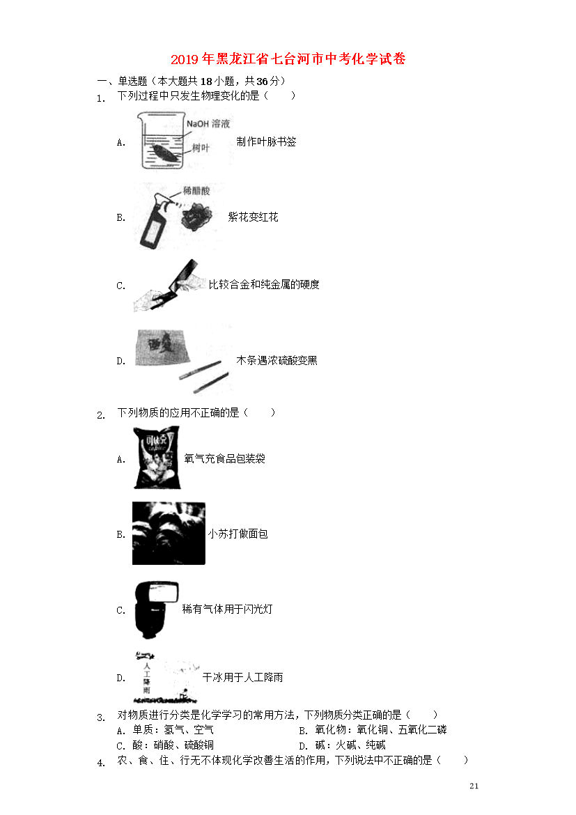 试题-黑龙江-2019_黑龙江省七台河市2019年中考化学真题试题(含解析)