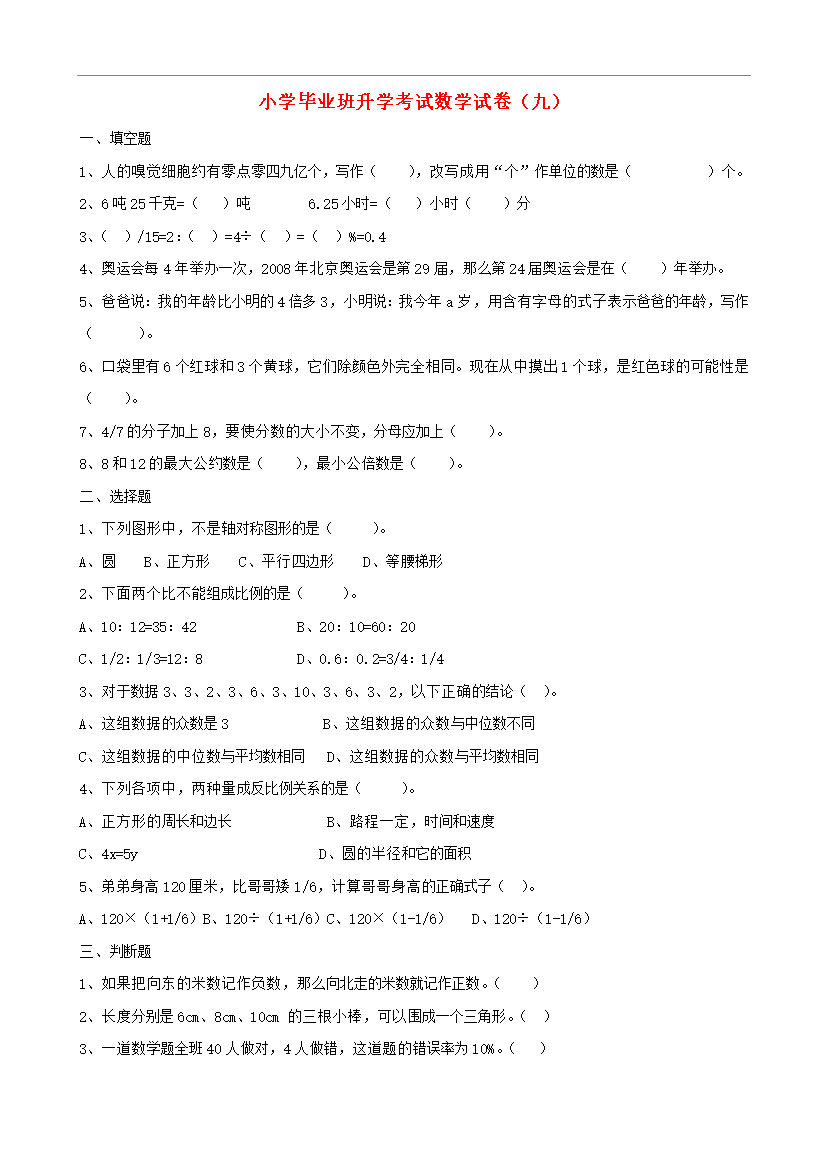 试题-全国-2013_小学数学毕业班升学考试试卷(9)(无答案)
