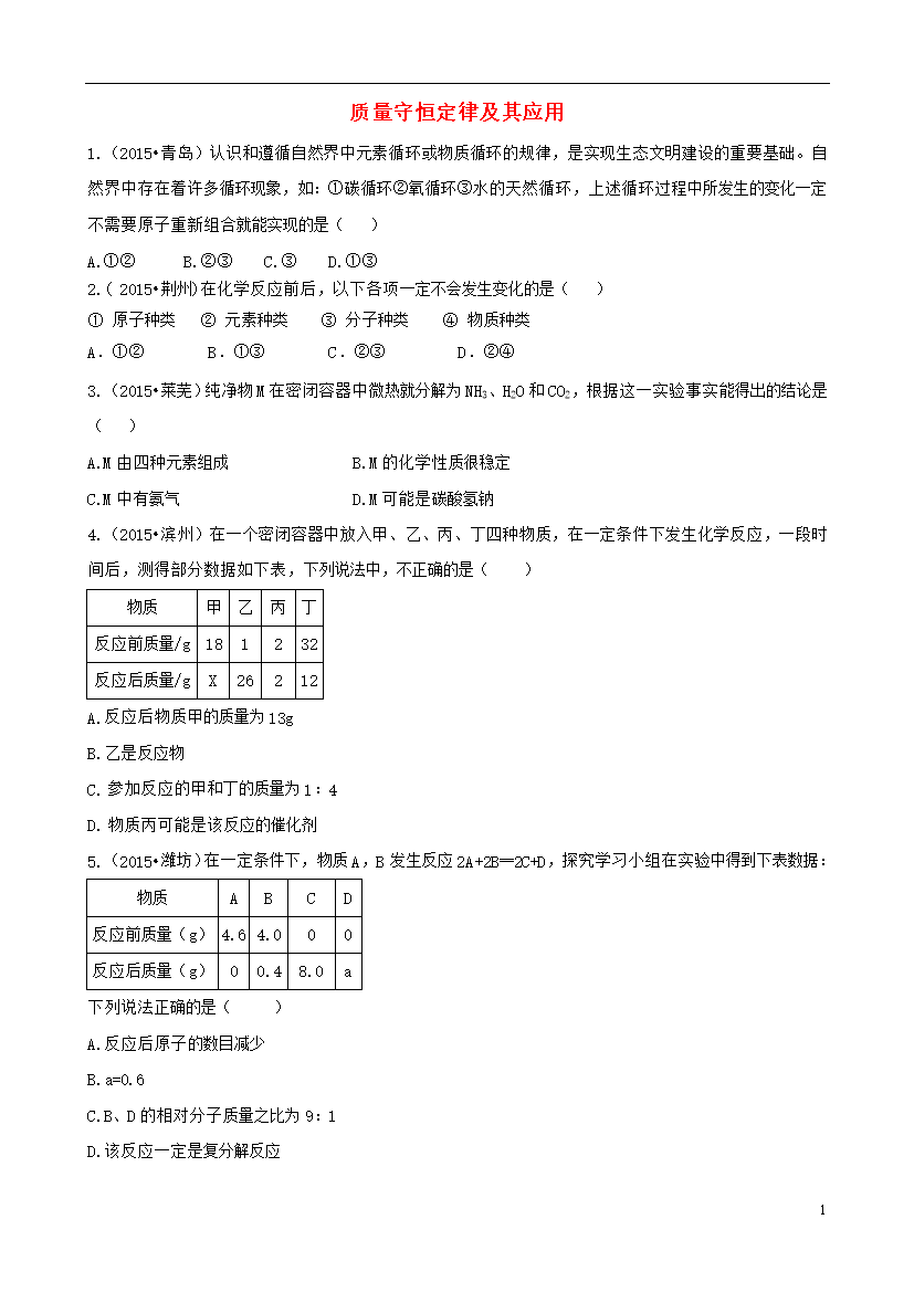 试题-全国-2015_迈进火线2016中考化学 高频热点题专练 质量守恒定律及其应用