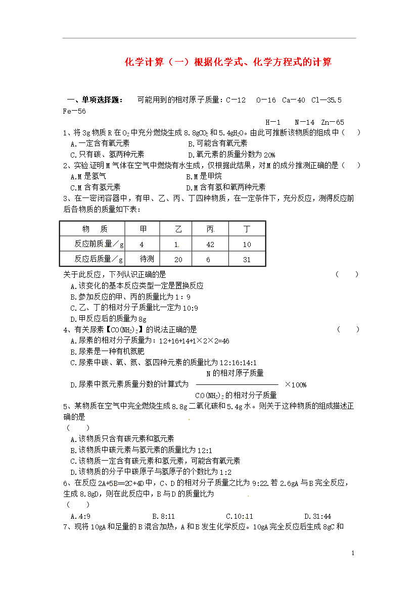 试题-全国-2013_2014中考化学专题复习训练四 化学计算(一)根据化学式、化学方程式的计算