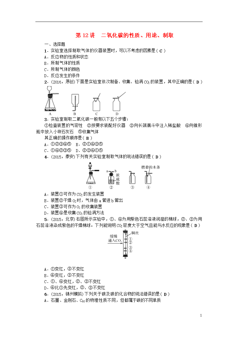 试题-辽宁-2015_辽宁省2016中考化学 考点跟踪突破 第12讲 二氧化碳的性质