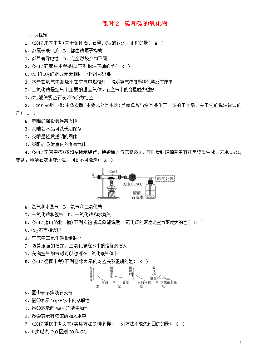 试题-全国-2019_(河北专版)2018届中考化学复习 第一编 教材知识梳理篇 模块一 身边的化学物质 课时2 碳和碳的氧化物练习