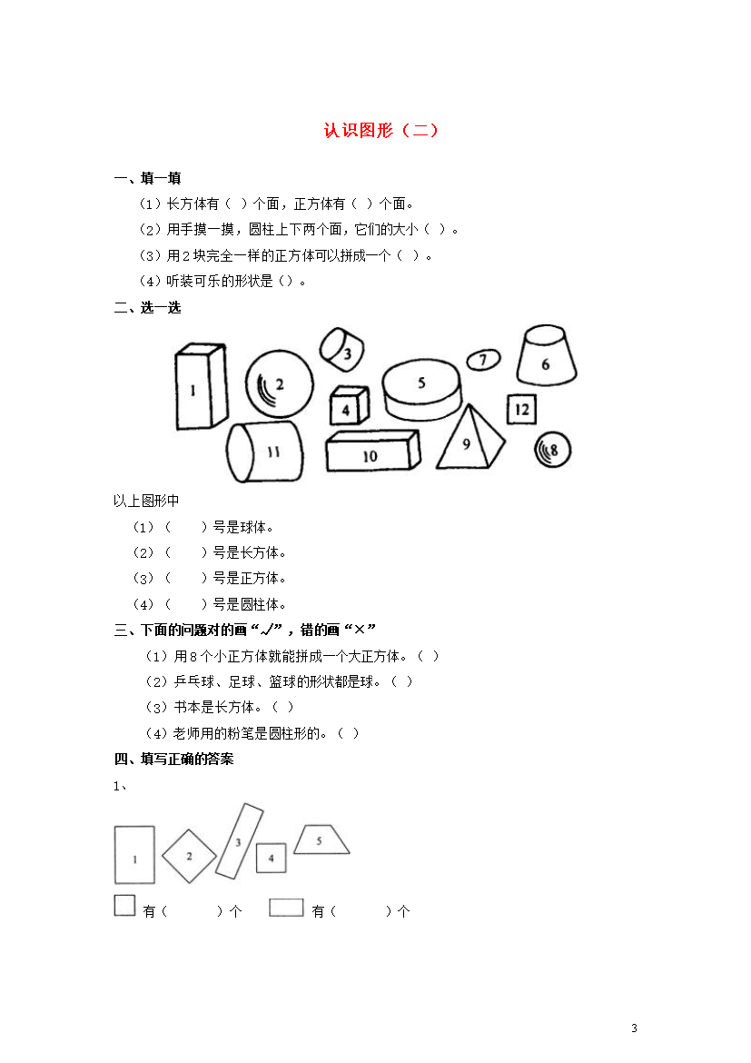 试题-全国-2019_一年级数学下册 第1单元《认识图形(二)》练习 新人教版