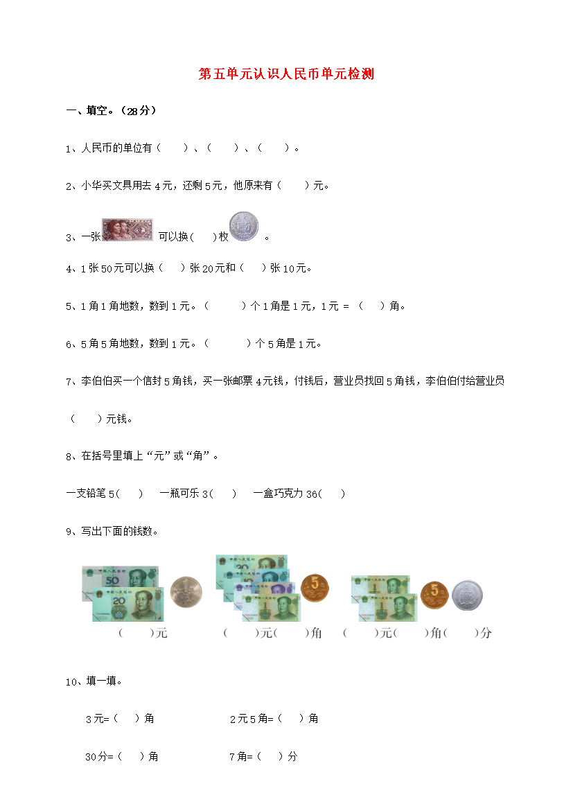 试题-全国-2020_一年级数学下册 第五单元 认识人民币检测卷 新人教版