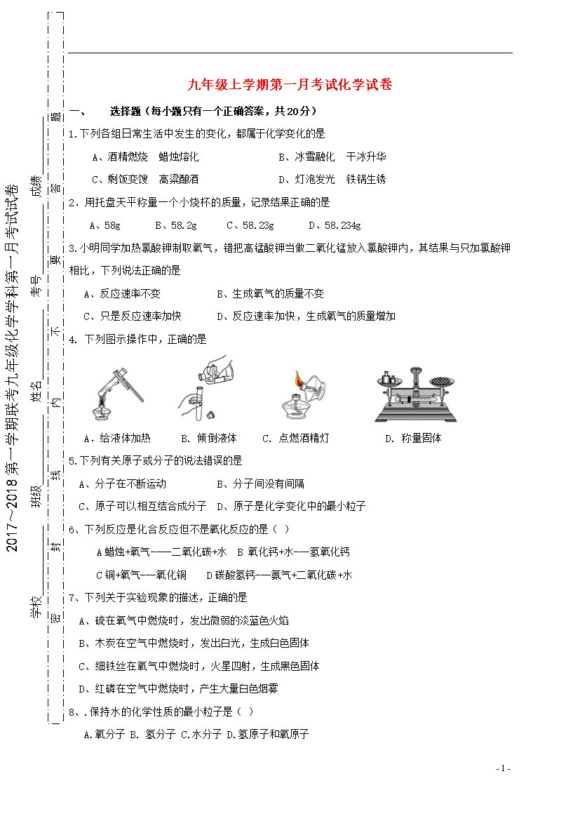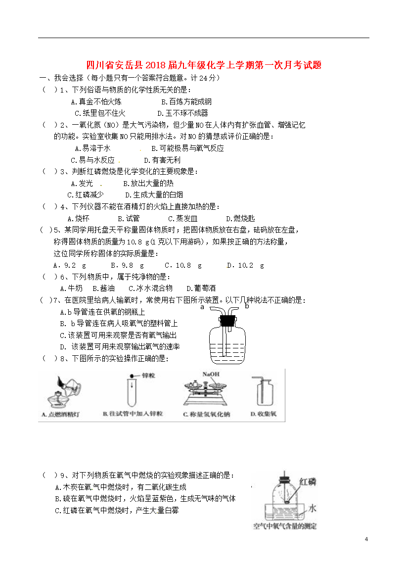 试题-四川-2018_四川省安岳县2018届九年级化学上学期第一次月考试题(无答案) 新人教版