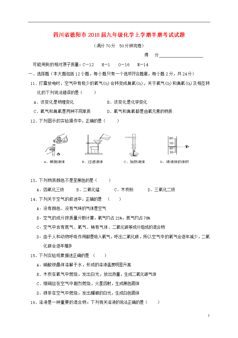 试题-四川-2018_四川省德阳市2018届九年级化学上学期半期考试试题 新人教版