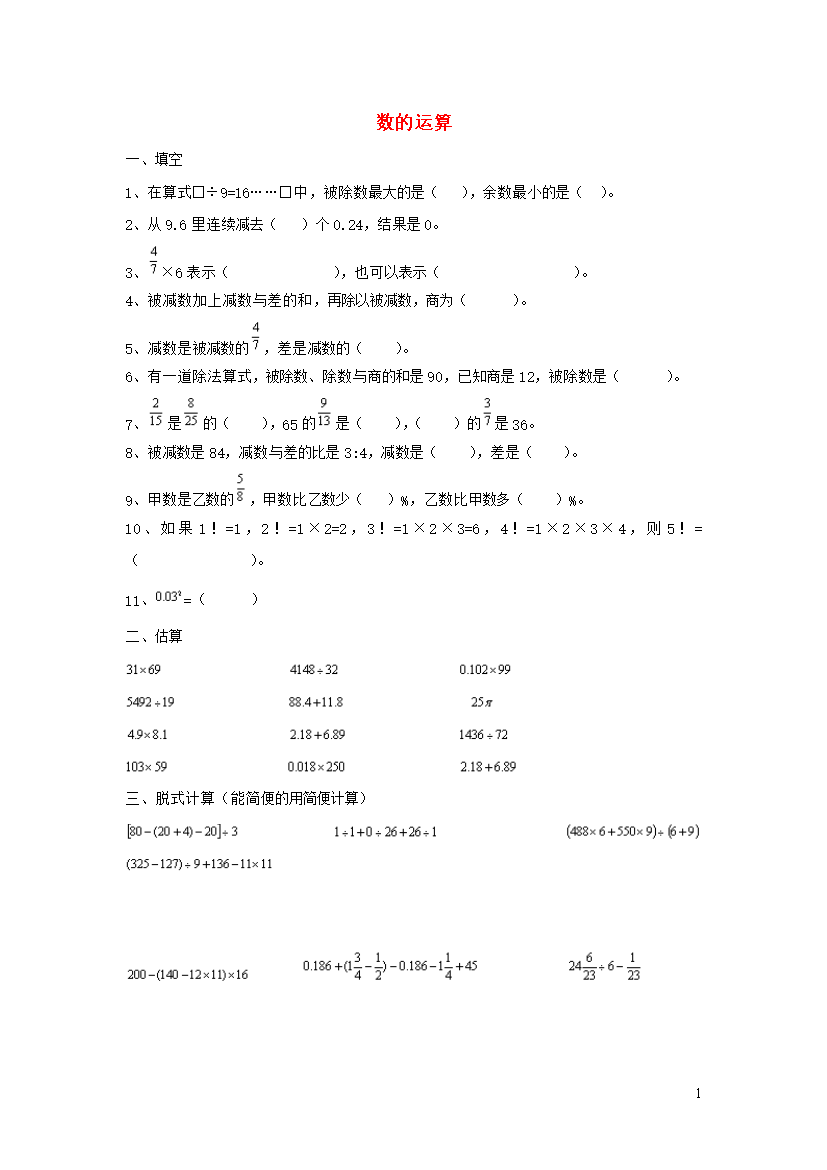 试题-全国-2019_2019年六年级数学下册 第七单元 总复习 1《数与代数》数的运算课堂作业(无答案) 苏教版