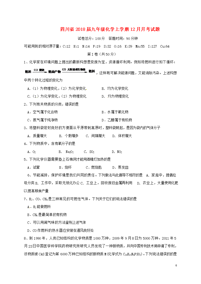 试题-四川-2018_四川省2018届九年级化学上学期12月月考试题(无答案) 新人教版