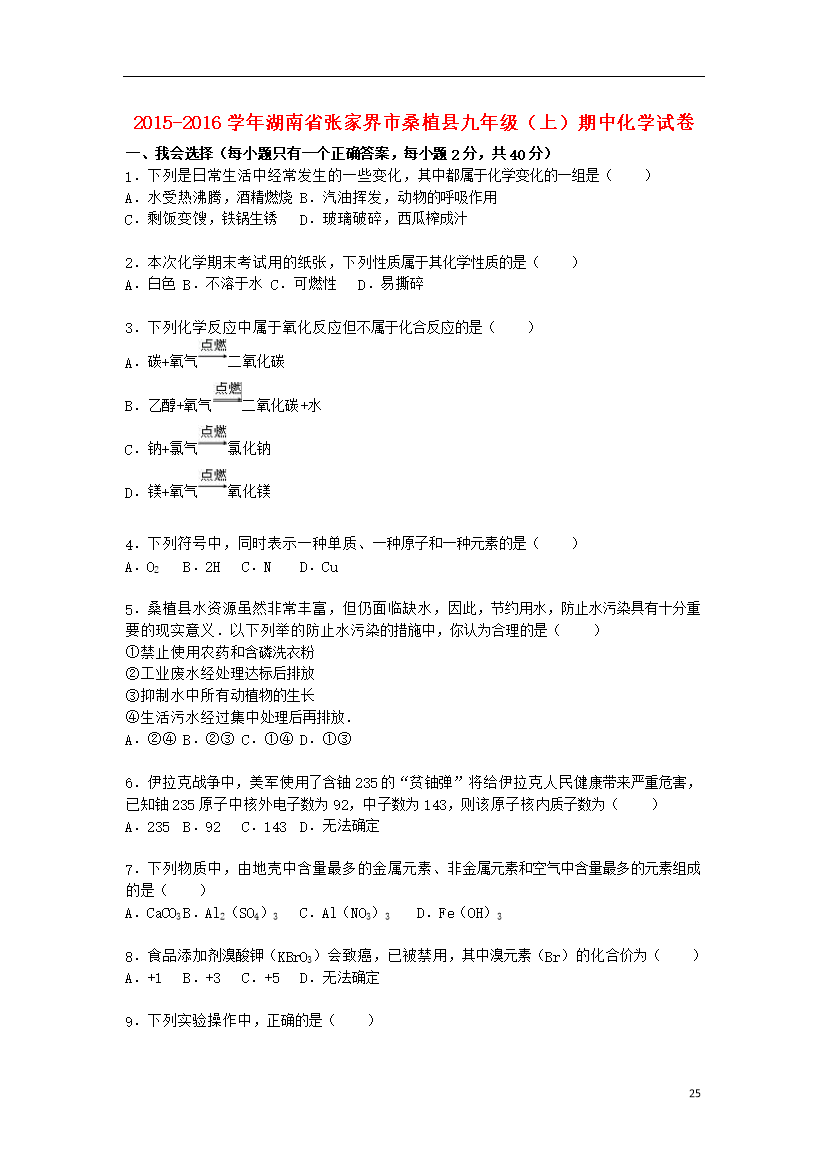 试题-湖南-2016_湖南省张家界市桑植县2016届九年级化学上学期期中试题(含解析) 新人教版