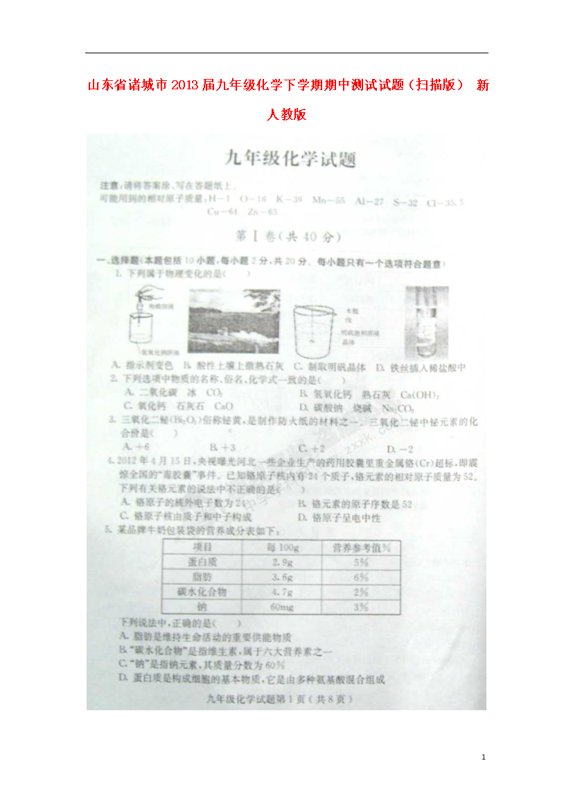 试题-山东-2013_山东省诸城市2013届九年级化学下学期期中测试试题(扫描版) 新人教版