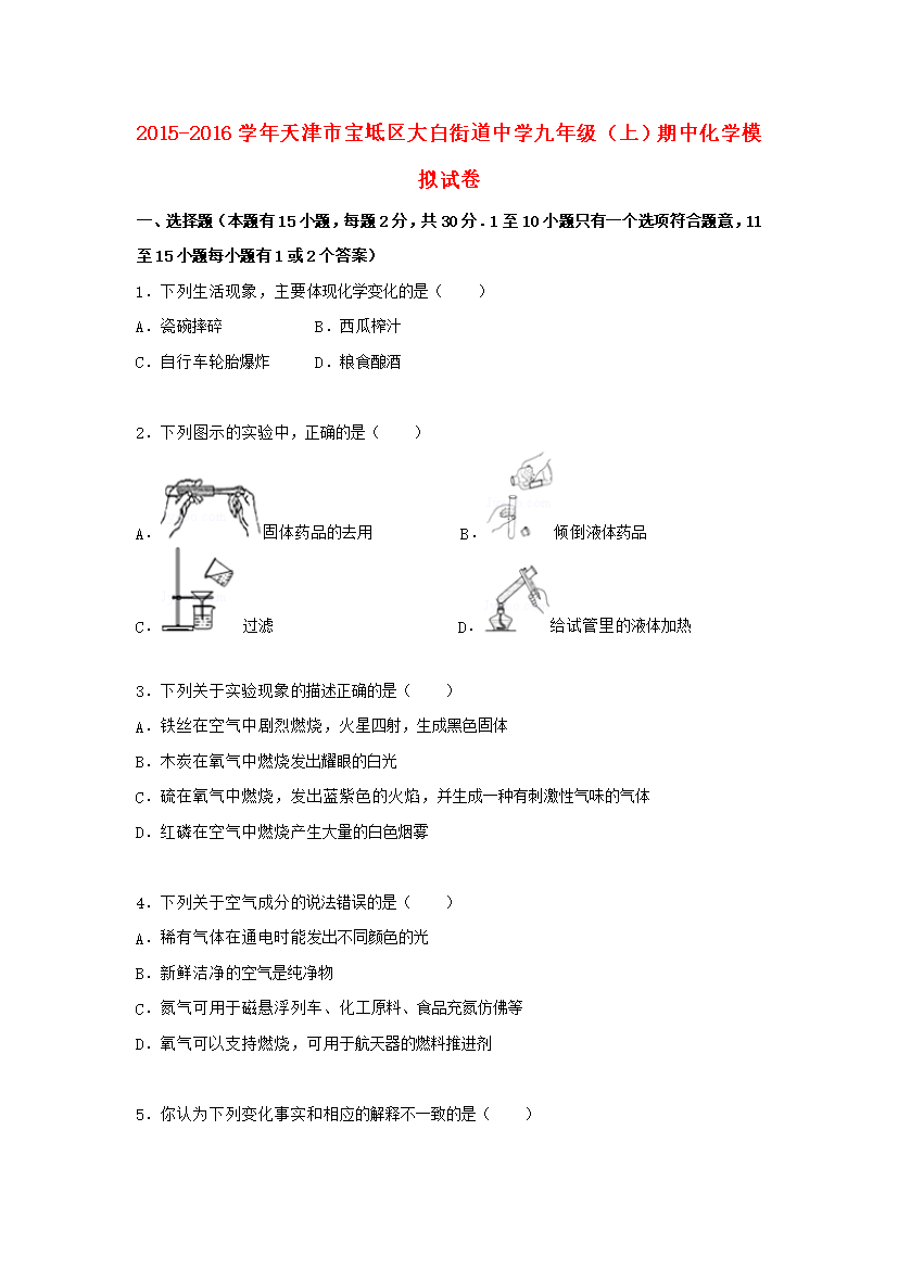 试题-天津-2015_天津市宝坻区大白街道中学2015-2016学年九年级化学上学期期中模拟试题(含解析) 新人教版