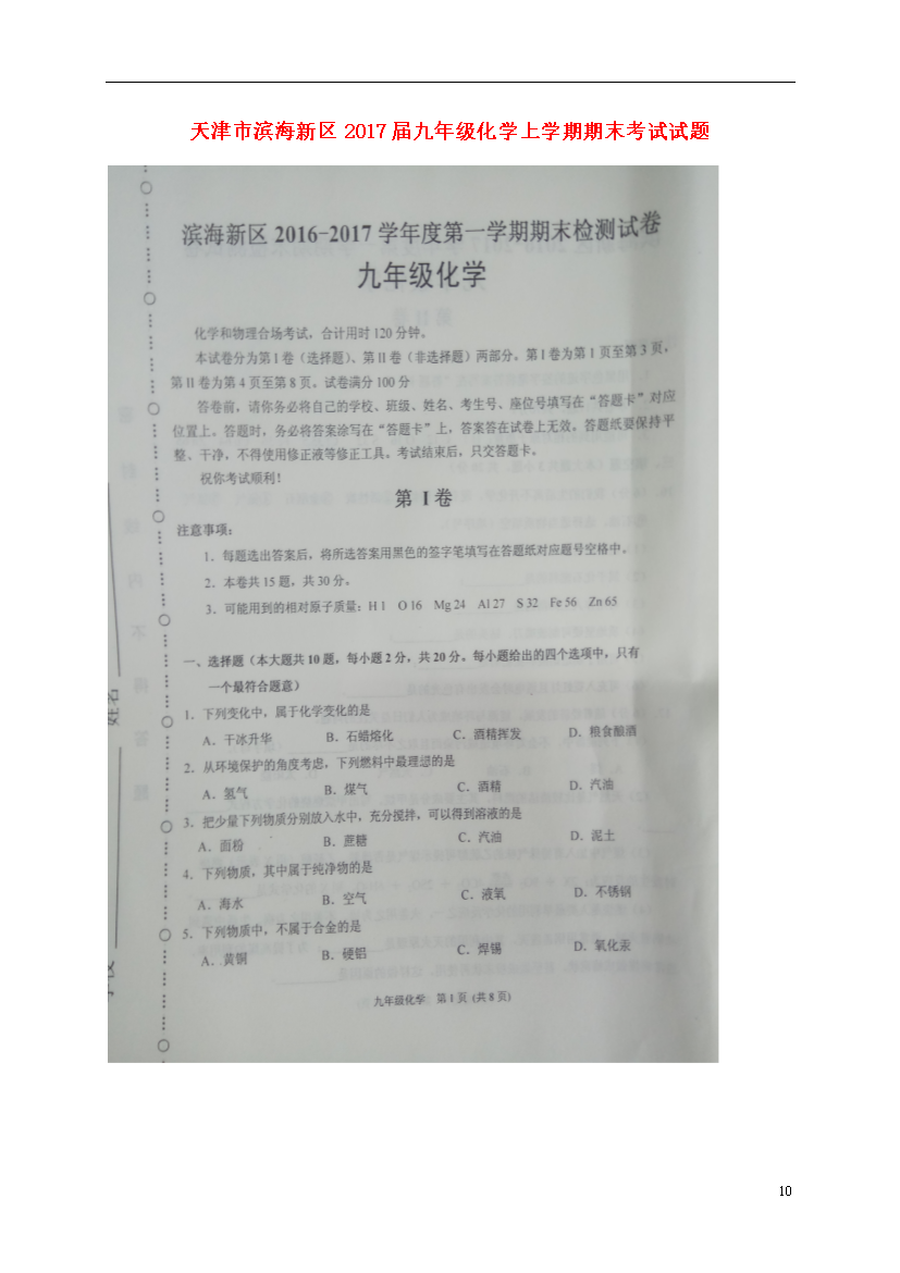 试题-天津-2017_天津市滨海新区2017届九年级化学上学期期末考试试题(扫描版) 新人教版