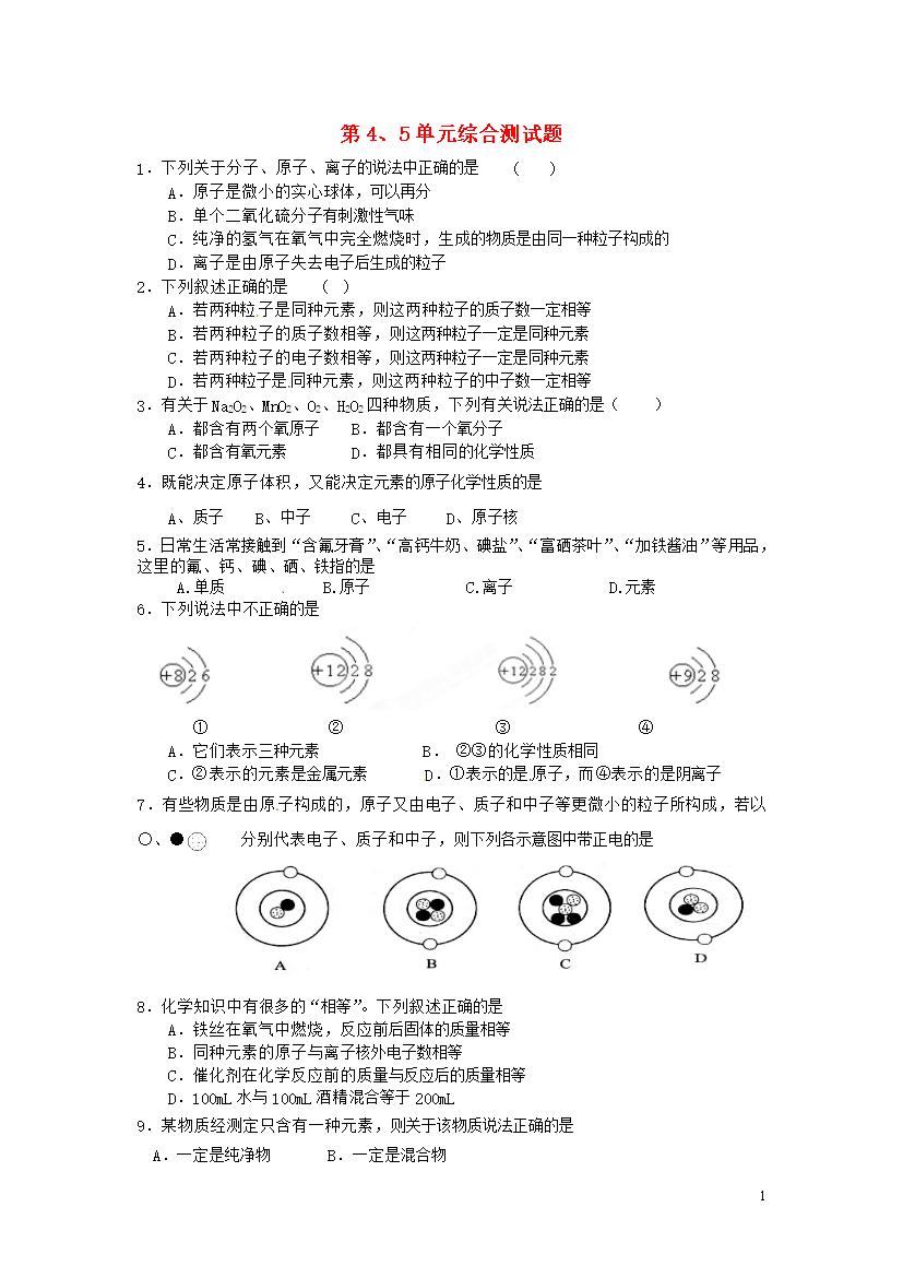 试题-山东-2014_山东省广饶县丁庄镇中心初级中学九年级化学上册 第4、5单元综合测试题(无答案) 新人教版