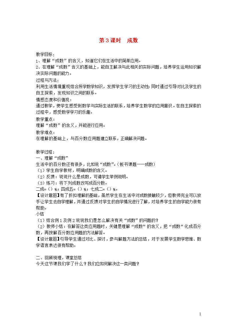教案-全国-2019_2019年六年级数学上册 第五单元 百分数的应用 第3课时 成数教案 冀教版