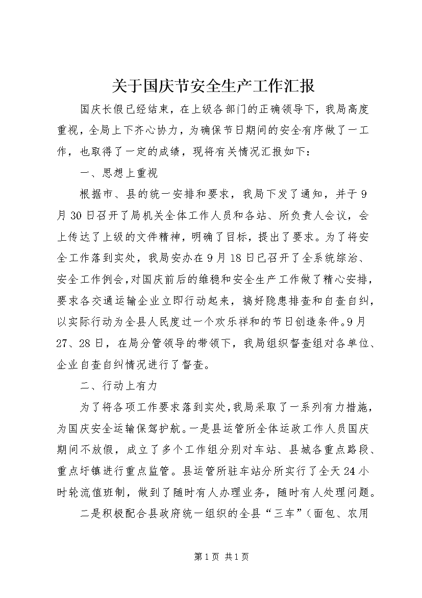 关于国庆节安全生产工作汇报