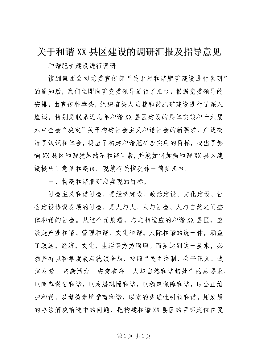 关于和谐XX县区建设的调研汇报及指导意见 (2)