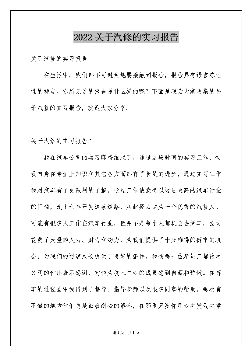 2022关于汽修的实习报告