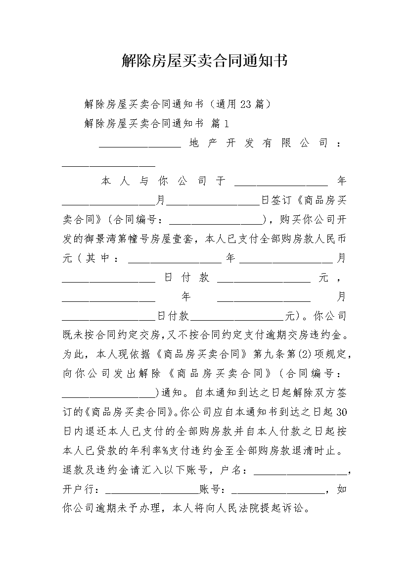 解除房屋买卖合同通知书