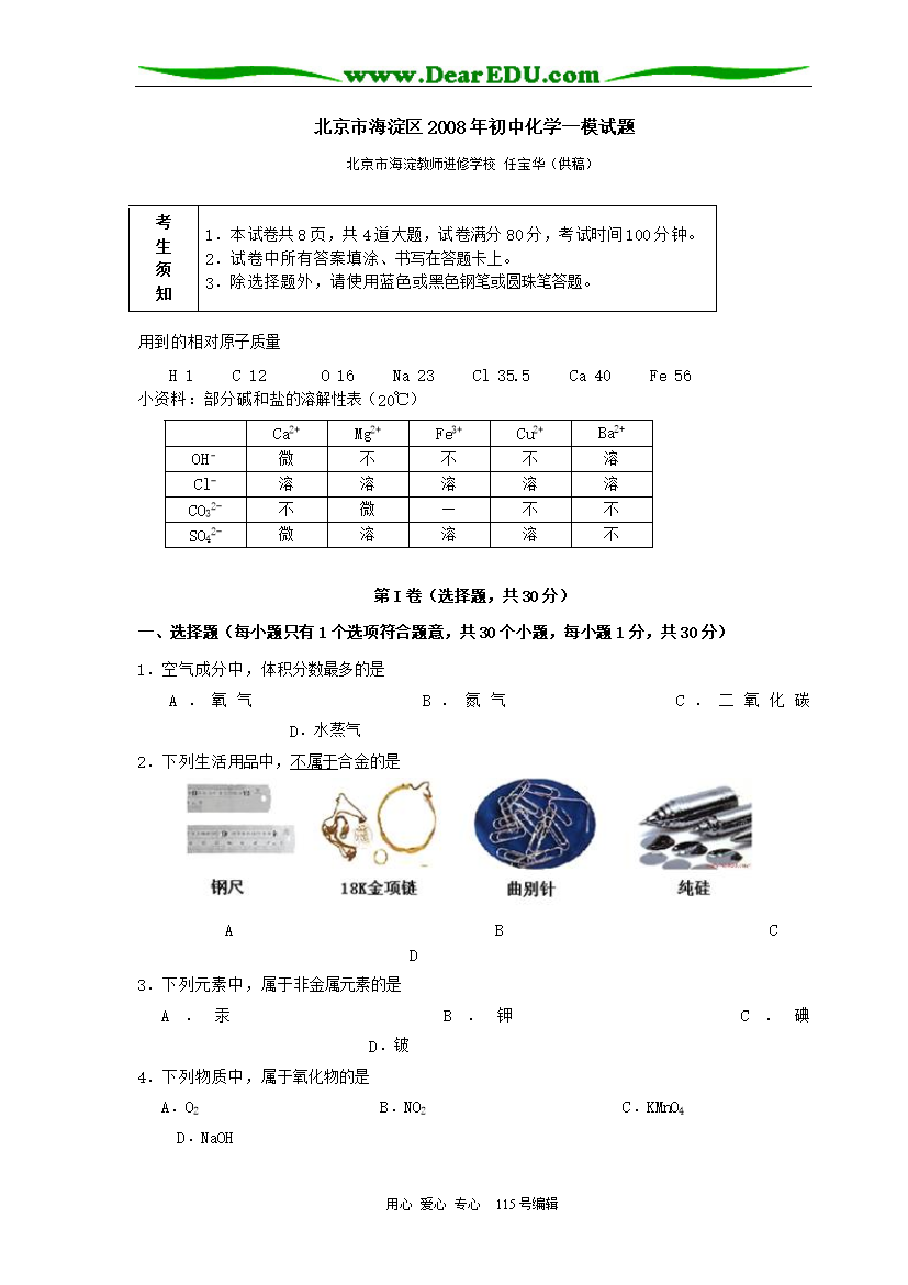 试题-北京-2008_北京市海淀区2008年初中化学一模试题