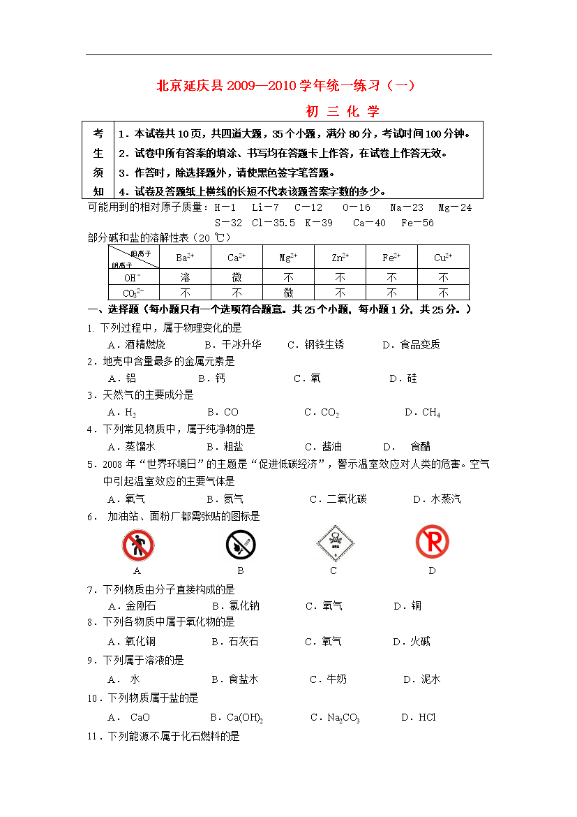 试题-北京-2010_北京延庆县2009-2010学年九年级化学统一练习(一)