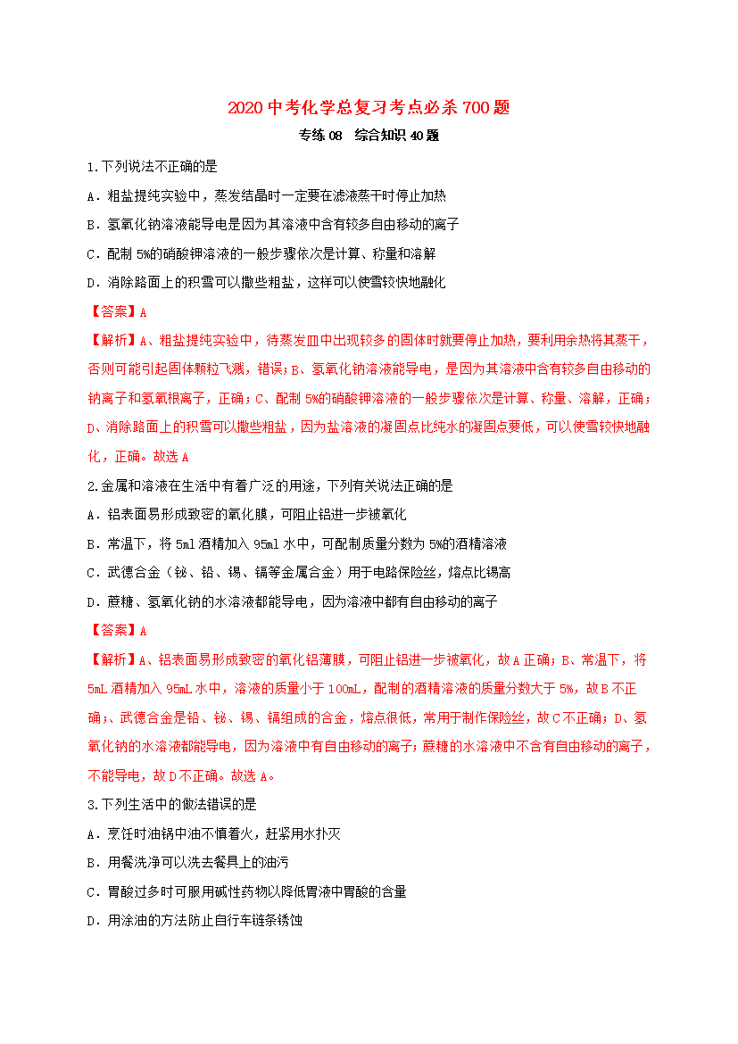 试题-全国-2020_2020中考化学总复习 考点必杀700题 专练08 综合知识40题(含解析)