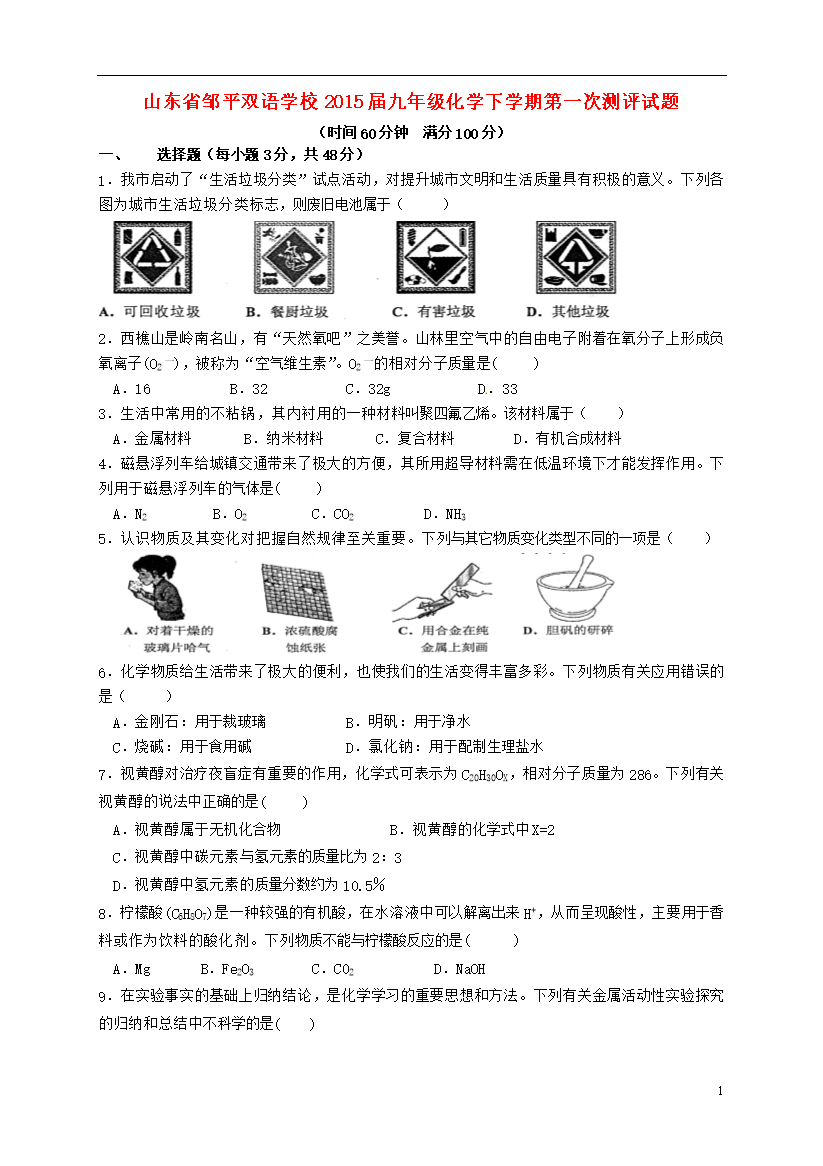 试题-山东-2016_山东省邹平双语学校2015届九年级化学下学期第一次测评试题(连读班,无答案)