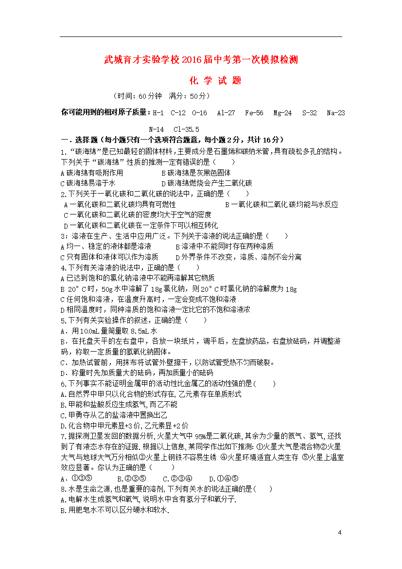 试题-山东-2016_山东省武城县育才实验学校2016届中考化学第一次模拟检测试题