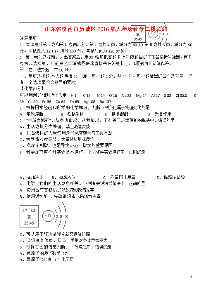 试题-山东-2016_山东省济南市历城区2016届九年级化学二模试题