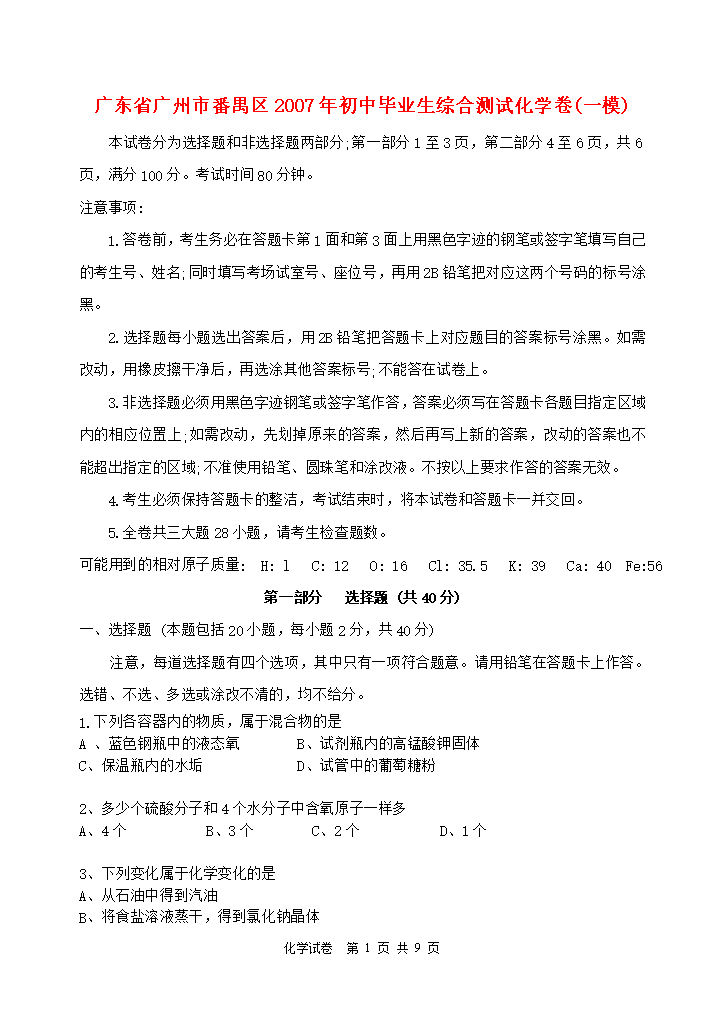 试题-广东-2007_广东省广州市番禺区2007年初中毕业生综合测试化学卷(一模)