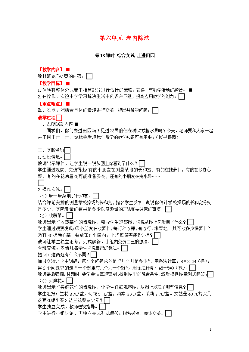 教案-全国-2019_2018学年二年级数学上册 第六单元 表内除法 第13课时 综合实践 走进田园教案 西师大版