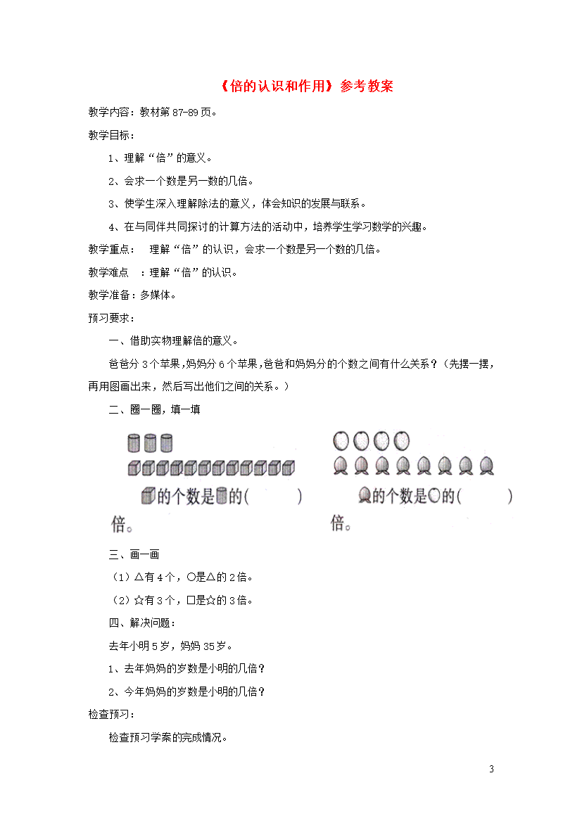 教案-全国-2020_二年级数学上册 七 制作标本-表内除法《倍的认识和应用》参考教案 青岛版六三制