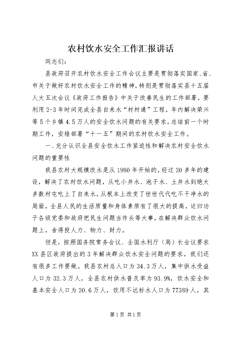农村饮水安全工作汇报讲话