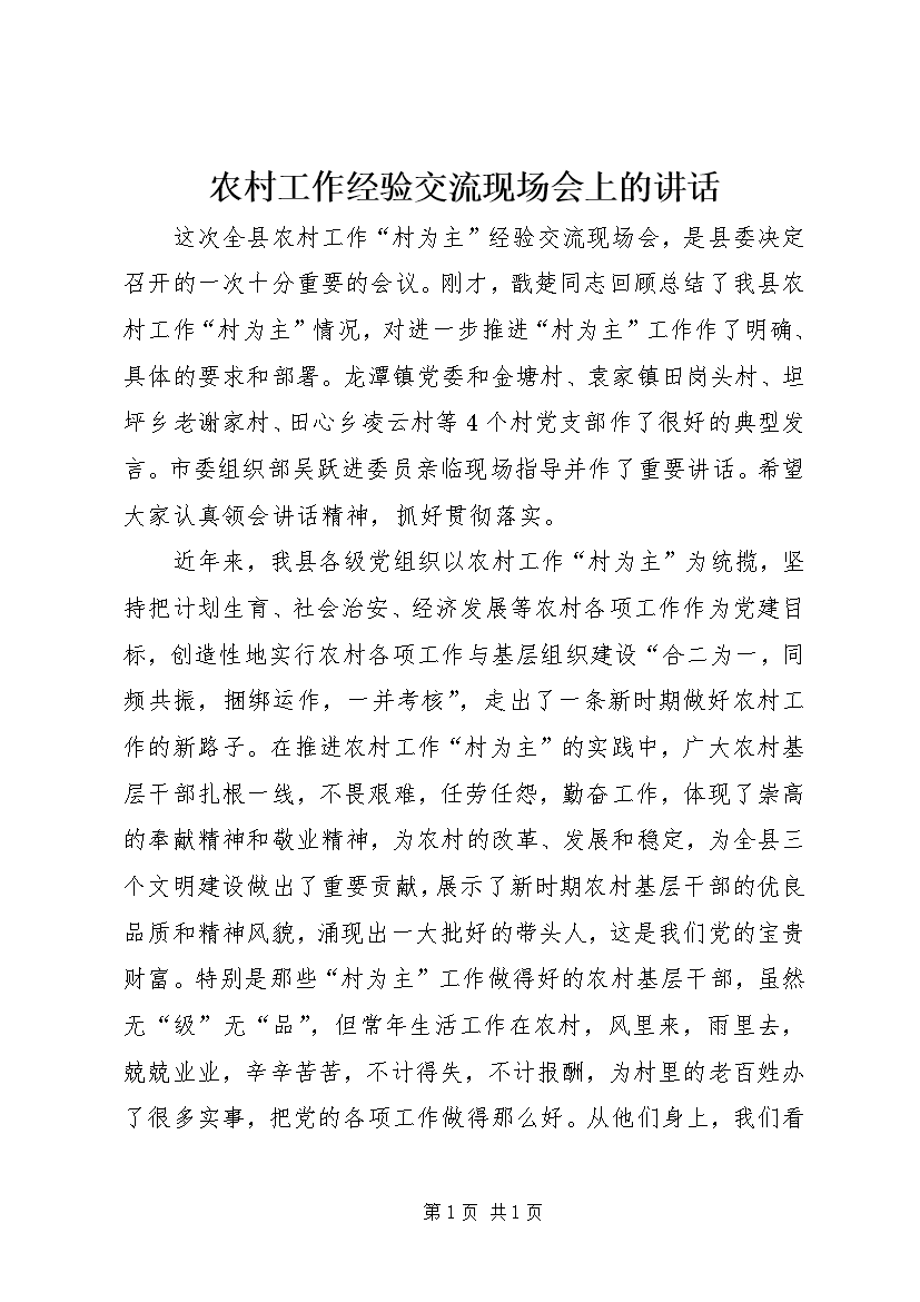 农村工作经验交流现场会上的讲话