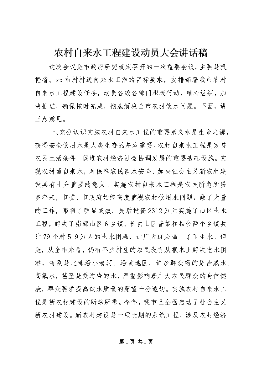 农村自来水工程建设动员大会讲话稿 (2)